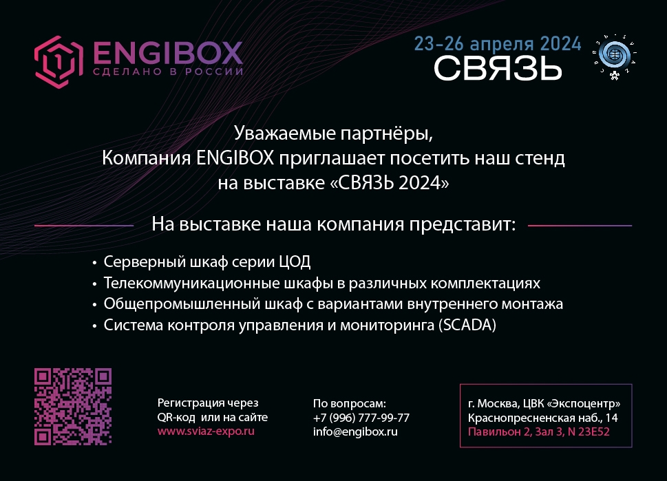 С 23 по 26 апреля 2024 г., компания ENGIBOX примет участие в выставке «СВЯЗЬ 2024», которая состоится в ЦВК «ЭКСПОЦЕНТР» (г. Москва, Краснопресненская наб., 14).